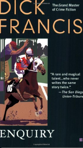 I should have read this book when it first came out in 1971. The cover price on a new paperback then was only 95 cents. It was only later that I discovered Dick Francis, whom I now consider to be one of the best mystery/thriller authors ever. To my mind Enquiry captures all the qualities that have since made him one of my favorite of all novelists. His writing is uncluttered and doesn't lose you in a huge cast of characters you can't keep track of. His plots are fresh, excitingly paced and filled with characters who seem remarkably human and three-dimensional with their passions, plotting, and motivations. So far I've read 27 of the 48 novels I believe he wrote solely or in his later decade with his son Felix. I still have 21 to go and I can't wait to read each of them. His protagonists vary. While several of them recur in several different novels, most of them are discrete different individuals with different backgrounds, occupations, histories and personalities. Francis who was at various times the steeplechase jockey of the Queen of England, a successful journalist, an RAF pilot, and an amazingly compelling and productive author, reflects some of his own past in creating the individual dramas of each book, almost always setting them in some relationship to British or international steeplechase or flat racing that somehow involves each of his sets of characters. His villains are genuinely dangerous and menacing. Each book draws clear distinctions between right and wrong, but don't make it a simple matter for his characters to make choices. None of them is perfectly good or perfectly evil, they are drawn from the issues of life and human relationships familiar to all of us. While Francis pere is no longer with us, his books still are. I enjoy them immensely and am happy to suggest you try them too if you haven't yet.